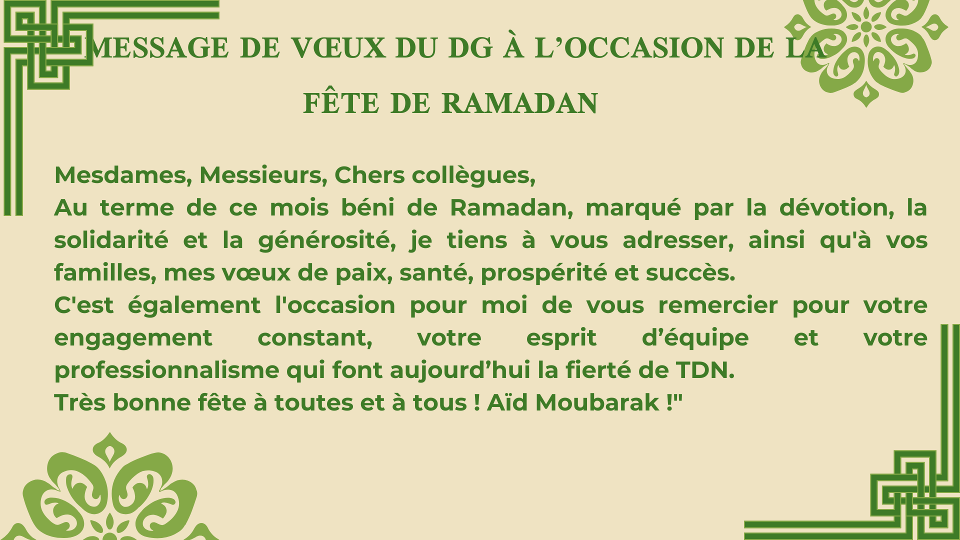 Mesdames, Messieurs, Chers collègues, Au terme de ce mois béni de Ramadan, marqué par la dévotion, la solidarité et la générosité, je tiens à vous adresser, ainsi qu'à vos familles, mes vœux de paix, santé, prospérité et succès. C'est également